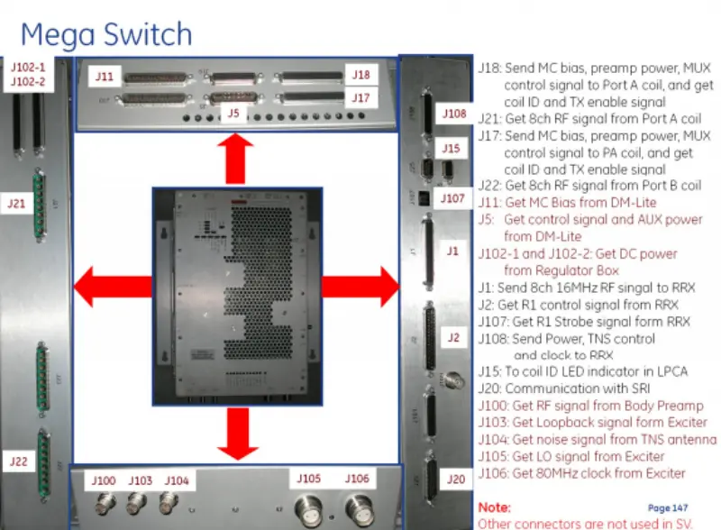 Comunicación SRI (J20): permite el intercambio de datos con entradas de señales externas SRI (J100, J103-J106): recibe señales de RF del preamplificador del cuerpo, señales de bucle invertido del excitador, señales de ruido de la antena TNS, señales LO y reloj de 80 MHz del excitador.